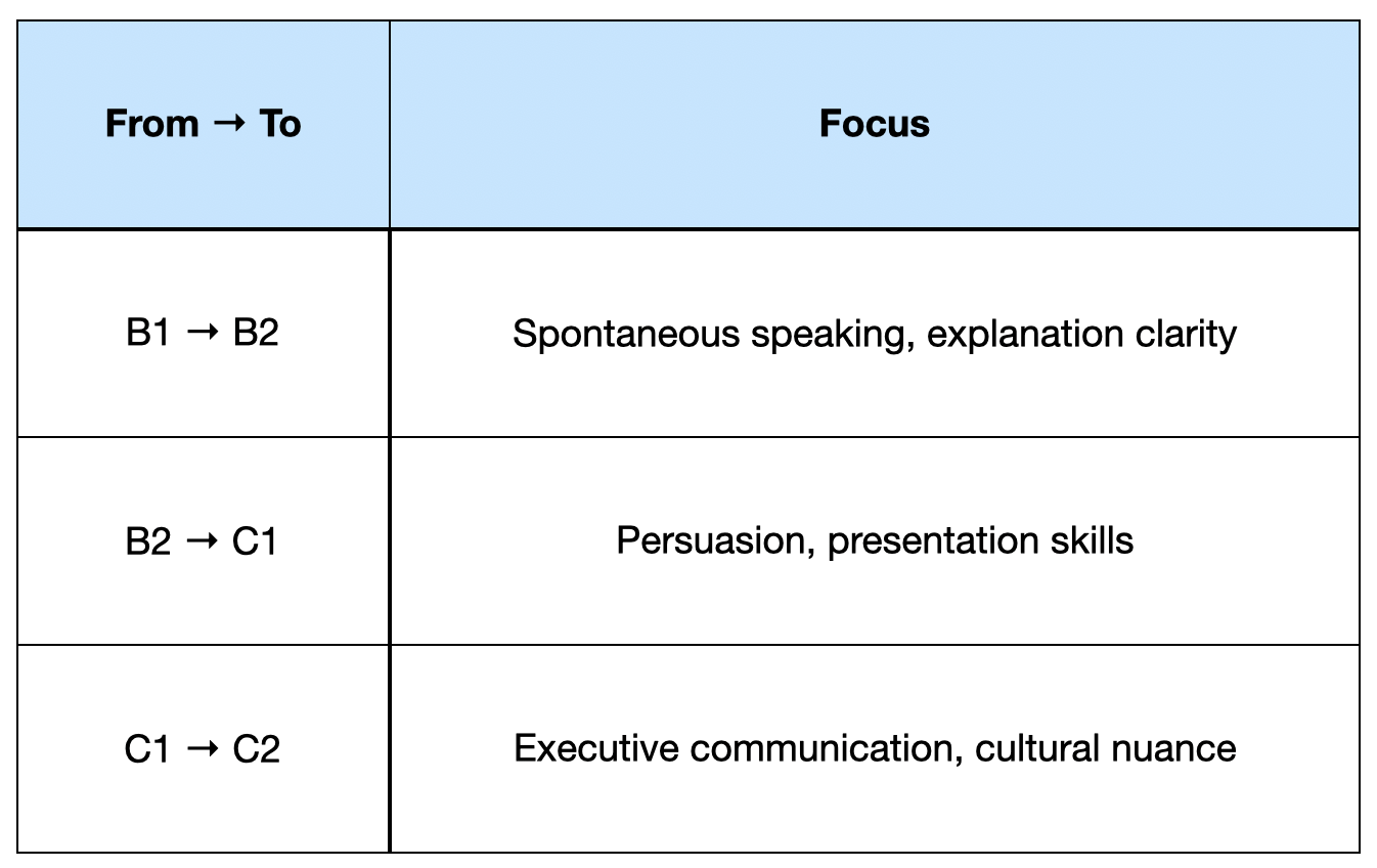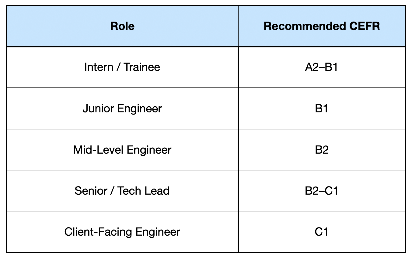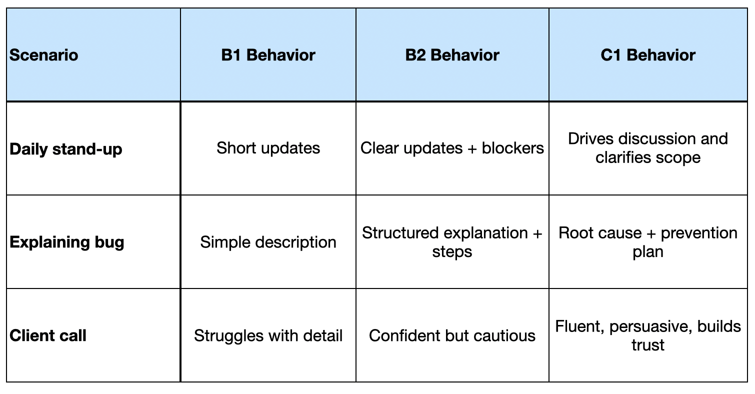 Tip: Pair CEFR with role-based scenarios (debugging, sprint planning, client demos, technical documentation)